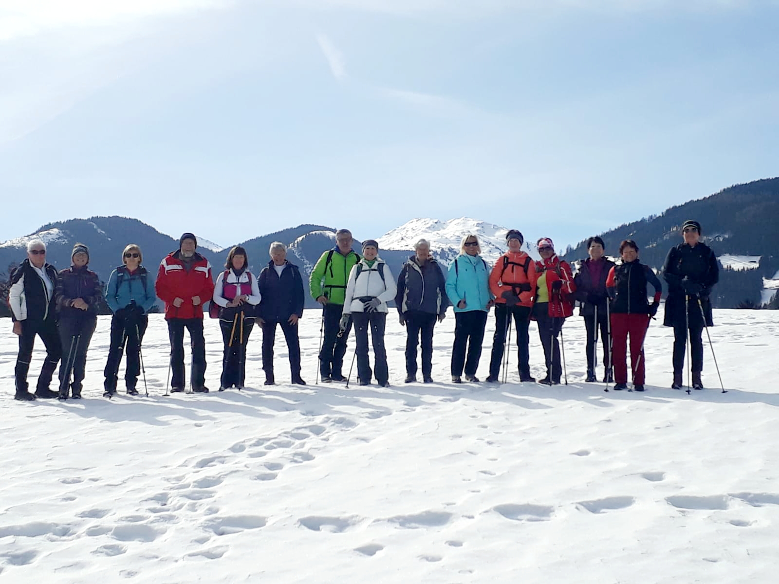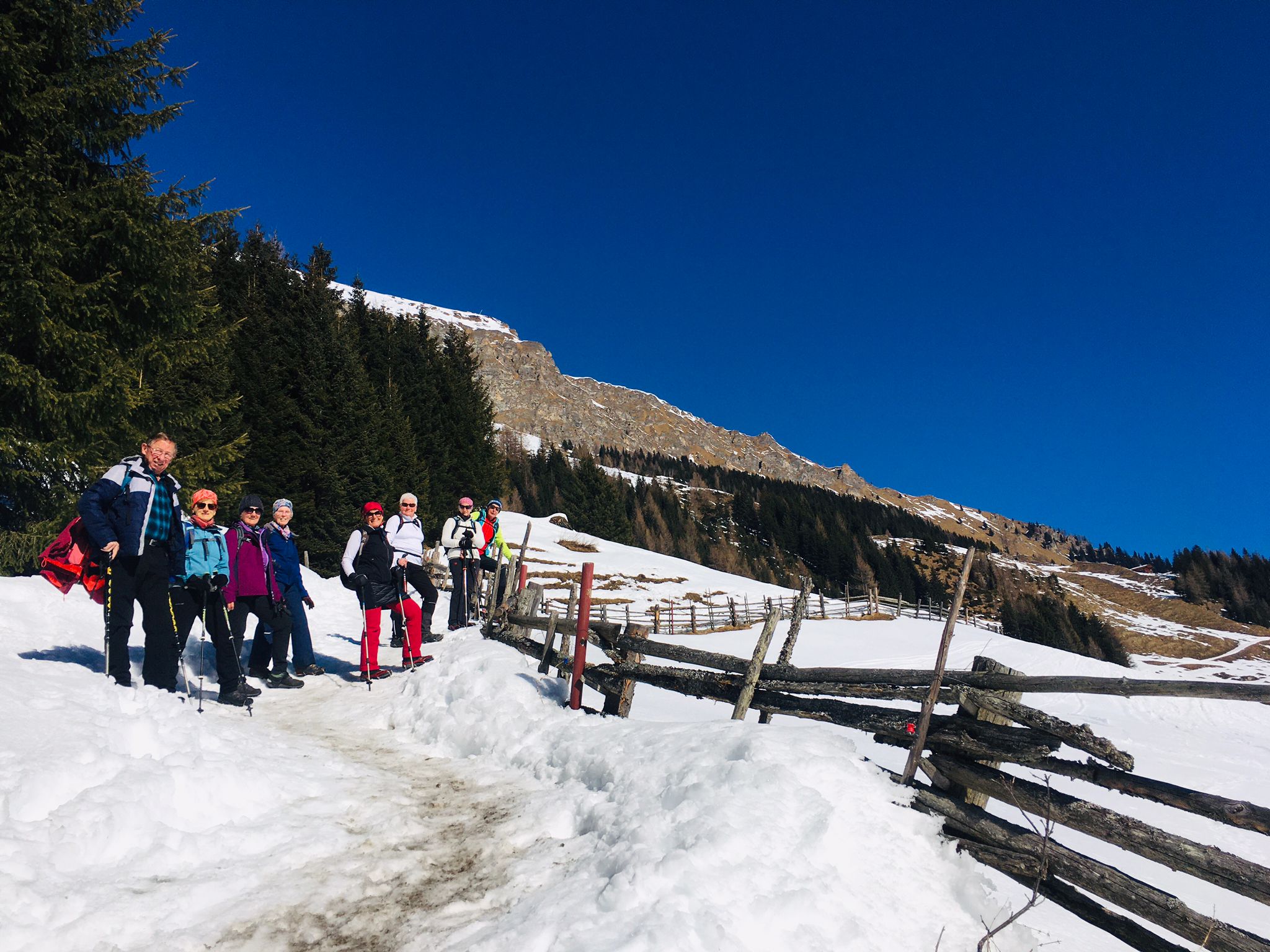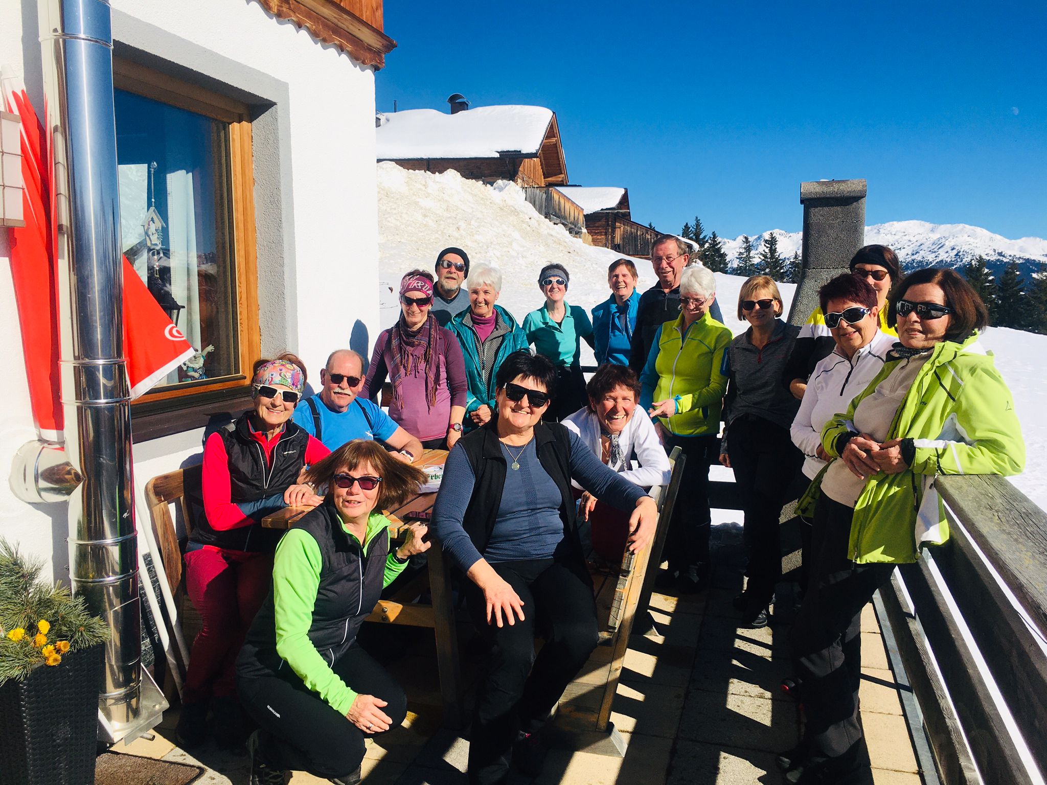 Das Gelungene an diesem Tag war noch, dass auch unsere Genusswandergruppe (16 Personen) an diesem Tag mit Wanderführer Walter unterwegs waren. Diese Gruppe fuhr mit der Penkenbahn ins Skigebiet von Mayrhofen und gingen über den Winterwanderweg von der Bergstation der Kombibahn zum Penkenjoch in Finkenberg. Gleichzeit trafen wir dort ein und konnten so die Einkehr in der Penkentenne gemeinsam genießen.